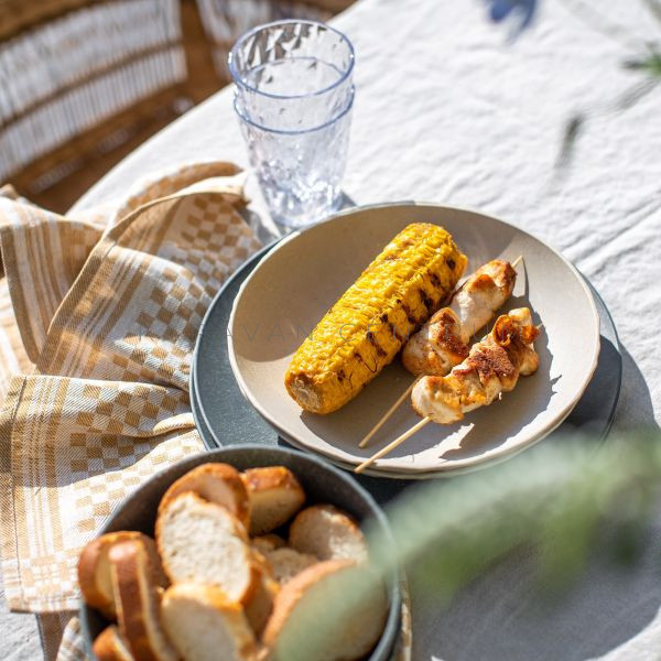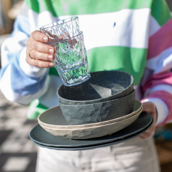 A divatos fazettázott szerkezetű, törésálló étkészlet a kempingezés, piknik és kerti partik fénypontja
