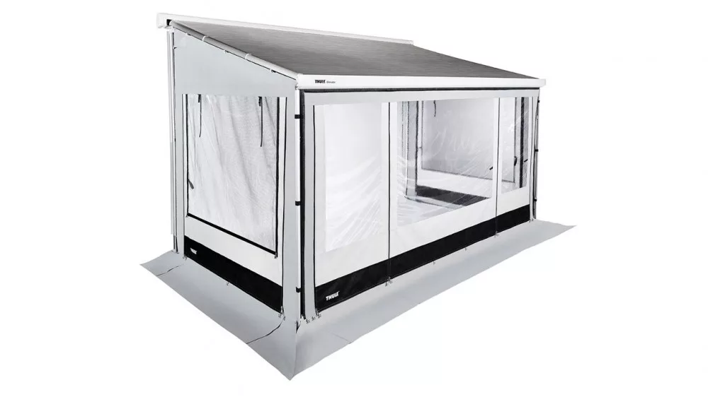 Az Thule előtetők frontblende sínjébe behúzható, teljesen feltekerhető homlokfal mindkét végén ajtó